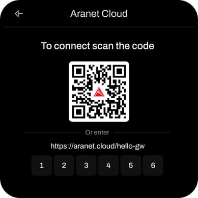 Please note that Gateway should be connected to the Wi-Fi or Ethernet and have access to the internet for successful connection to Aranet Cloud. When you have established an internet connection, go to the home screen (or stay in the configuration wizard) and press on Aranet Cloud (or on Connect to Aranet Cloud in wizard) to proceed with the connection.