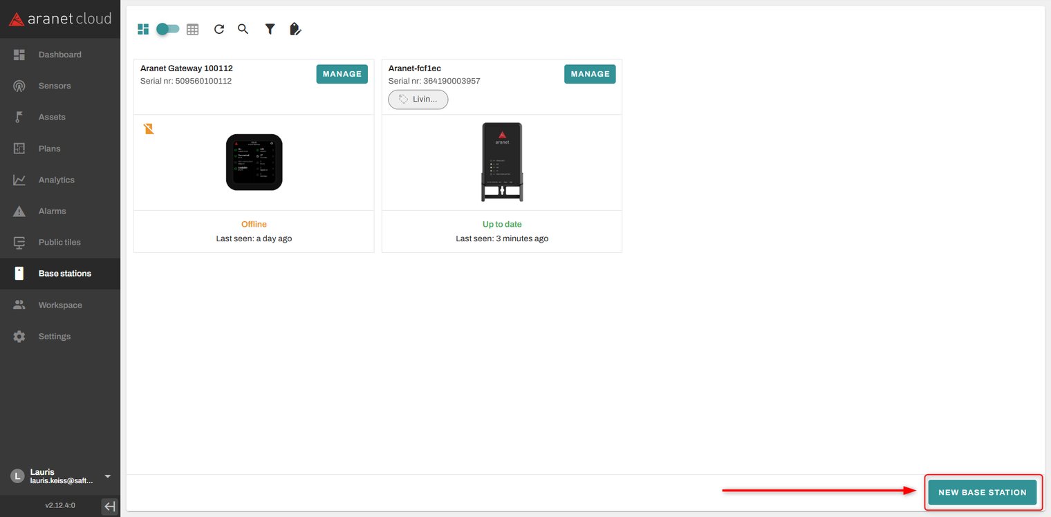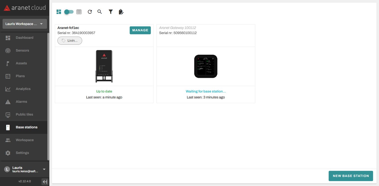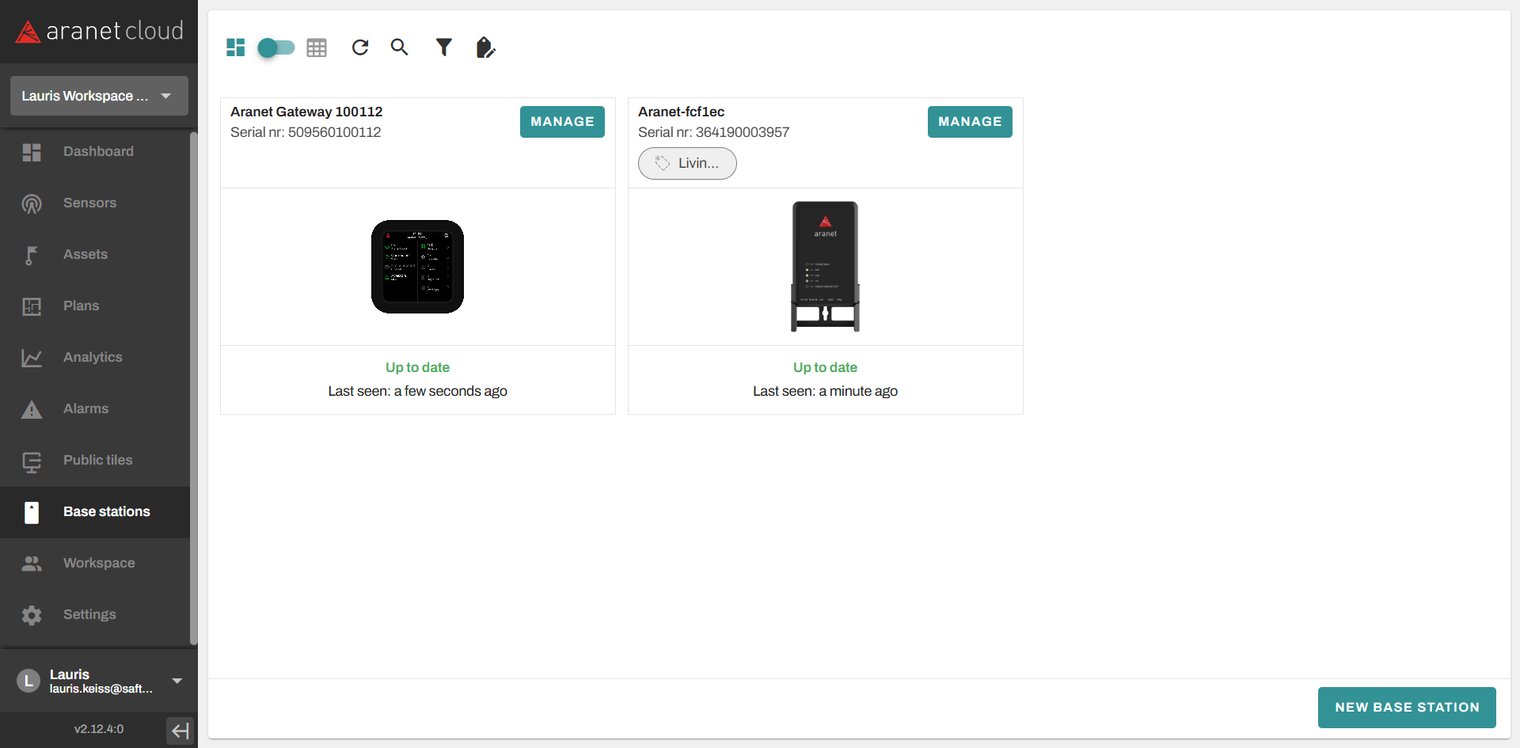 Aranet PRO base can be connected to Aranet Cloud by registering it to the Workspace. The Aranet Cloud Workspace creation process is described in this topic: How to create Aranet Cloud workspace