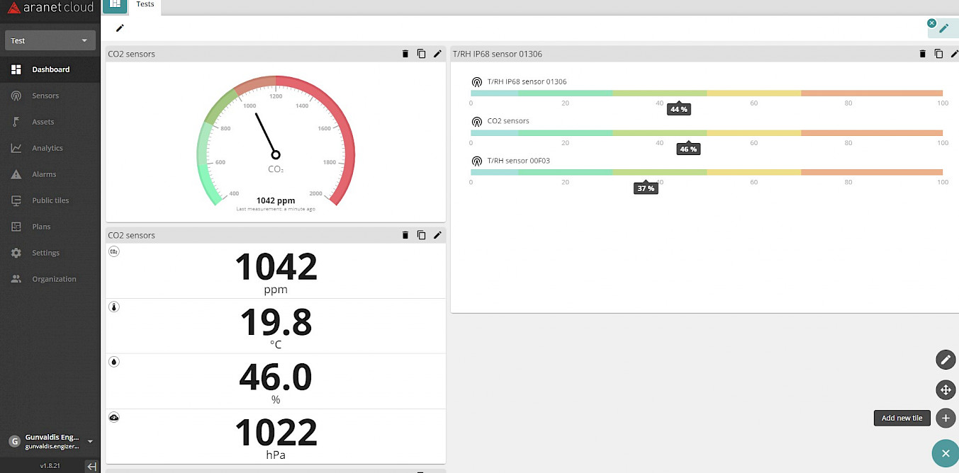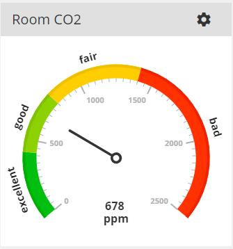 Aranet Cloud dashboard tile Gauge widget presents sensor data in a "speed-o-meter' view.